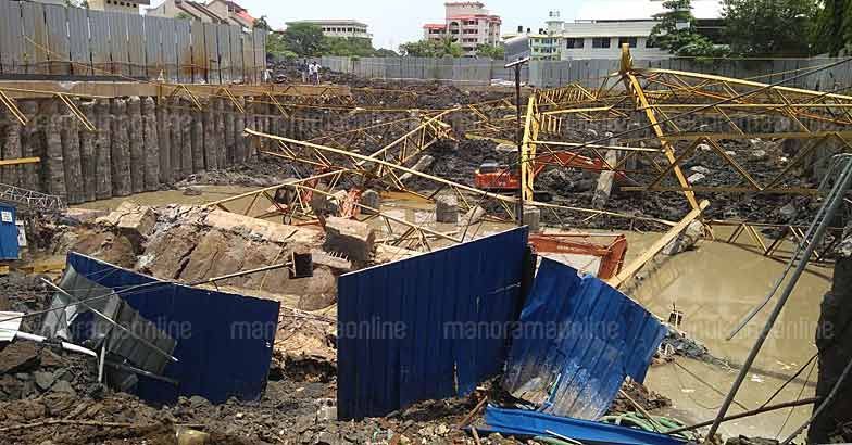 A building under construction caved in close to the metro track between Kaloor and the Lisie Hospital Junction Thursday. Photo: ManoramaOfficials said that a crater had formed on the roadside, close to the section where metro pillars were erected. The under-construction building collapsed when piling works were being carried out near Gokulam Park. Pumping of water from Aluva has been halted as the water pipe belonging to the Kerala Water Authority was ruptured following the incident.
