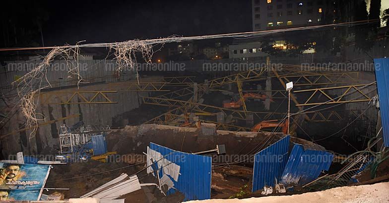Officials said a crater has formed on the roadside, close to the section where metro pillars are erected. The under-construction building collapsed when piling works were being carried out near the Gokulam Park. Pumping of water from Aluva has been halted as the water pipe belonging to the Water Authority city was ruptured following the incident.