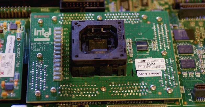 Intel demonstrates the all-in one smartphone Manitoba PXA800F chip that contains a processor, a digital signal processor, and flash memory. Photo: Getty Images