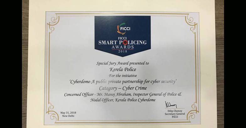 Cyberdome was selected for the ISLA honour at its 12th annual meet. The SKOCH Order-of-Merit was conferred during the SKOCH Summit in New Delhi. The FICCI SMART Policing Award in the category of cyber security was handed over to the Kerala Police during the Homeland Security 2018 conference held on May 31 in New Delhi.