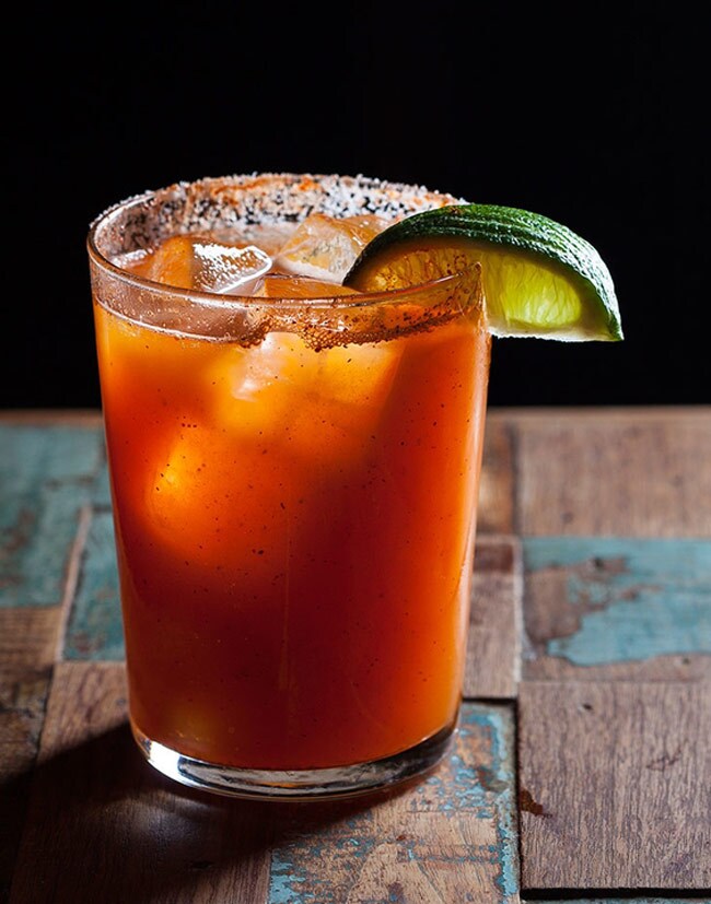 Rim the beer tankard with a mix of salt and pink peppercorns