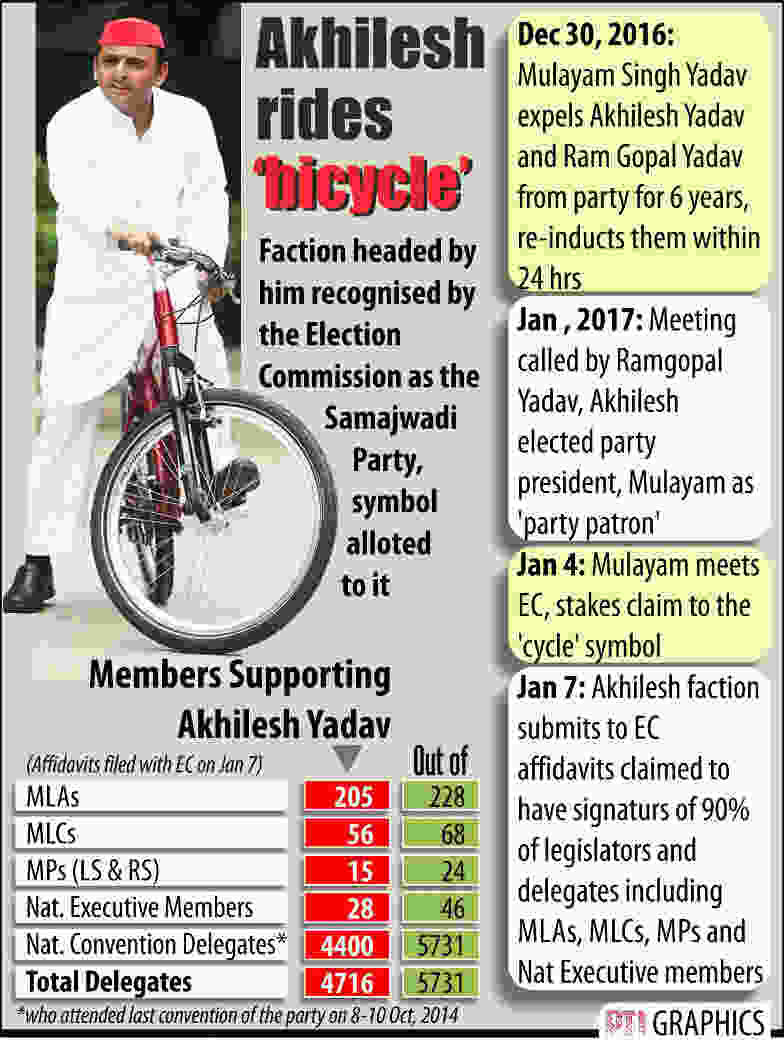 New Delhi: Dealing a severe blow to Mulayam Singh Yadav, the Election Commission on Monday gave the symbol 'Bicycle' to the faction headed by Akhilesh Yadav, recognizing it as the Samajwadi Party that came as a major boost to the chief minister ahead of assembly polls in Uttar Pradesh.