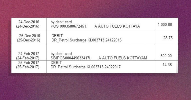Statements of surcharge levied on petrol purchase. State Bank of India officials said that they had not received any intimation regarding the central government’s decision and they were still charging 2.5 percent as surcharge on every fuel purchase using debit cards.