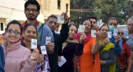 Voters from Sant Swaminarayn Gurukul showing their voter ID cards at a polling booth during Gujarat Assembly election in Surat on Saturday. PTI