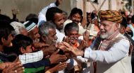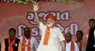 A BJP leader felicitates prime minister Narendra Modi during his election campaign rally for Assembly election in Lunawada town of Panchmahal district of Gujarat on Saturday. PTI