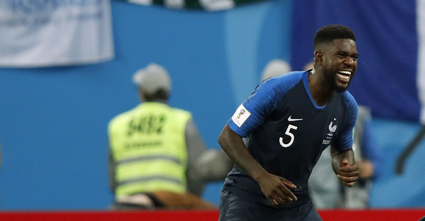 France's Raphael Varane celebrates after Croatia's Mario Mandzukic (not pictured) scored an own goal. Reuters