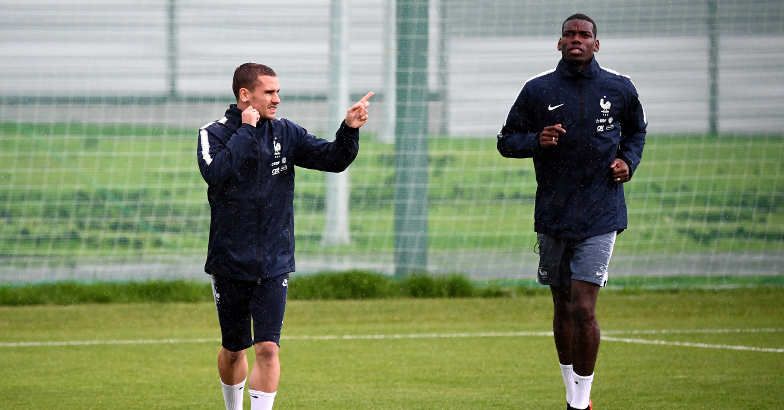 France's Antoine Griezmann, left, and Paul Pogba attend a training session at the Glebovets Stadium in Istra, Moscow, on Monday. AFP