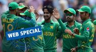 Mohammad Amir (center) of Pakistan celebrates after dismissing Shikhar Dhawan of India during the ICC Champions Trophy final match at the Kia Oval cricket ground in London on Sunday. Getty Images