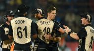 New Zealand players celebrating the wicket of India's Shikhar Dhawan during the third and final T20I cricket match at Greenfield Stadium in Thiruvananthapuram. PTI