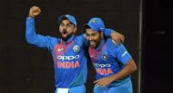 India's Rohit Sharma celebrates with skipper Virat Kohli after taking a catch to dismiss New Zealand's Colin Munro during the third and final T20I at Greenfield Stadium in Thiruvananthapuram. PTI