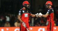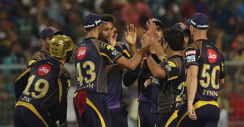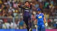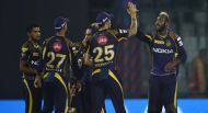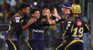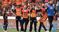 Chennai Super Kings' Karn Sharma (C) with teammates Suresh Raina (R) and MS Dhoni celebrates after taking a wicket against Sunrisers Hyderabad. PTI