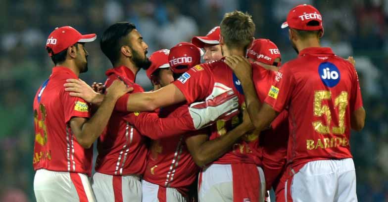 Kings XI Punjab players celebrate after taking a wicket against Delhi Daredevils. PTI