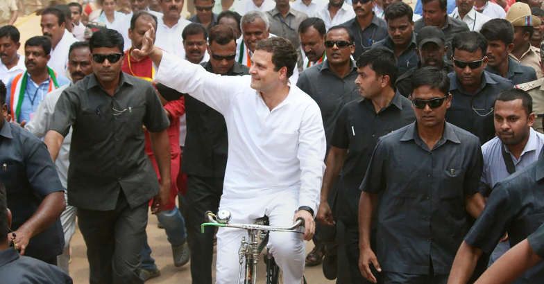 Congress president Rahul Gandhi rides a bicycle to protest against the fuel price hike at Malur in Kolar district on Monday. PTI