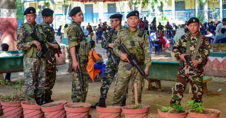 Mizoram Aam Police personnel stand guard at a EVM distribution centre in Bengaluru. PTI