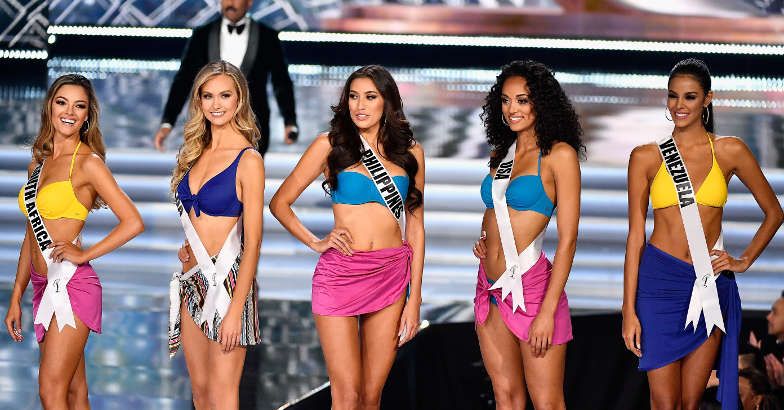 Miss USA 2017 Kara McCullough, Miss Philippines 2017 Rachel Peters, Miss Canada 2017 Lauren Howe, Miss South Africa 2017 Demi-Leigh Nel-Peters, and Miss Spain 2017 Sofia del Prado compete in the evening gown competition during the 2017 Miss Universe Pageant