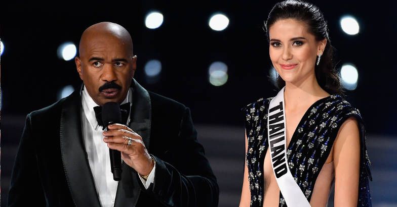 Television personality and host Steve Harvey (L) onstage with Miss Thailand 2017 Maria Poonlertlarp as she answers a question during the interview portion of the 2017 Miss Universe Pageant