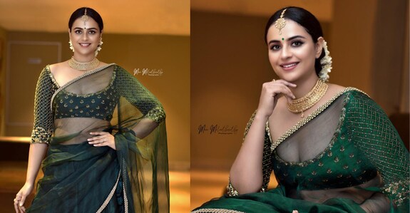 Tehlan looked stunning at the music launch of Mamamangam, in forest green lehenga with her dupatta draped like a sari, by one of her favourite designers, Boat Song.