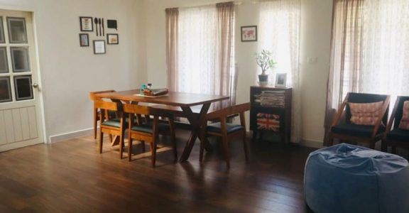 “The dining area is our favourite spot in the house. This space is the perfect spot which connects the kitchen and with the rest of the areas. From the kitchen, one could easily see and talk to the ones who are relaxing in other areas. The dining table made in timber has chairs on one side and a bench on the other,” says Divin.