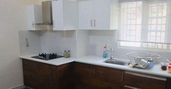 Instead of granite, matte finished tiles are paved on the floor in the sit out. Meanwhile, the same tiles with a different texture are used in the interiors. Tiles in lighter shade are used for flooring in the living area. This makes the interiors look spacious and brighter as well. The kitchen, meanwhile, is furnished with lots of sliding and regular cupboards to make it extremely functional.