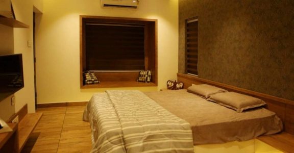 The bay window is an attractive feature in the master bedroom. A wall here is highlighted using attractive wall paper. A small working space has been arranged near the TV unit. Storage spaces are arranged under the cots in the bedrooms. The family is thrilled that they could give a stylish makeover for their house and update the features by retaining the beloved memories that are associated with the abode.