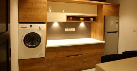 The kitchen cabinets, meanwhile, are done in multi-wood by pasting laminate sheet. The nano white counter top adds a sheen to the kitchen. A part of the kitchen has been turned into a multipurpose area where the refrigerator and the washing machine are kept. A breakfast counter in the middle completes the kitchen area. Marine plywood has been used for furnishing the interiors.
