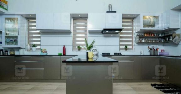 Both the interiors and the exteriors stand out for the serene charm of the white hue. Lots of windows and openings ensure excellent cross ventilation inside the house. The furnishing, meanwhile, is done in marine ply with veneer finish. Vitrified tiles, in white colour, are paved on the floor. The living and the kitchen areas are highlighted using wooden and grey finish. Interesting wooden elements are seen on the gypsum false ceiling as well. The LED lights on it play a vital role in granting a splendid ambience to the spaces.