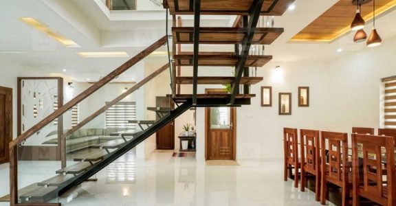 An elegant L-shaped leather couch is what adorns the formal living area. The wooden flooring is the highlight here. The beautiful stairway designed in the transparent – suspended style is the centre piece of the interiors. This also acts as a semi-partition that separates the living and the dining areas. The handrails, meanwhile, feature the classy combination of glass and metal. The dining table can easily accommodate up to eight guests. The matching chairs complete the chic dining table. This area that has a double-height ceiling lets in lots of natural light and air into the house.