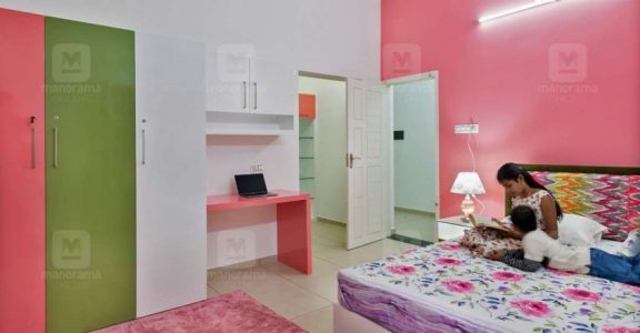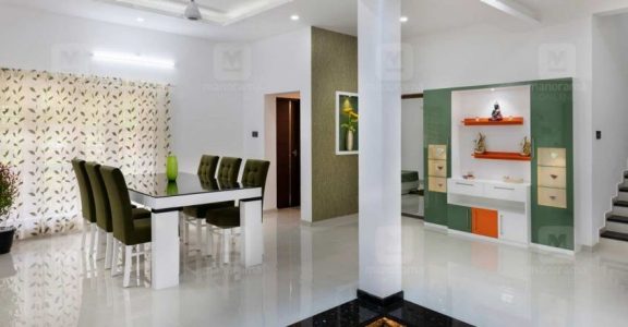 Rajesh is thrilled to show around his brand new house that is close to the Thiruvalla town in Kerala, yet away from the bustle of it. The slope roof and the cladding and textured features are the highlights of the elevation of this modern house. Though white colour theme is predominant in the house, the beautiful highlighter shades add a chic look to the spaces.