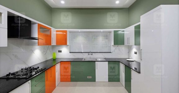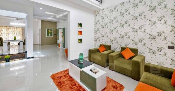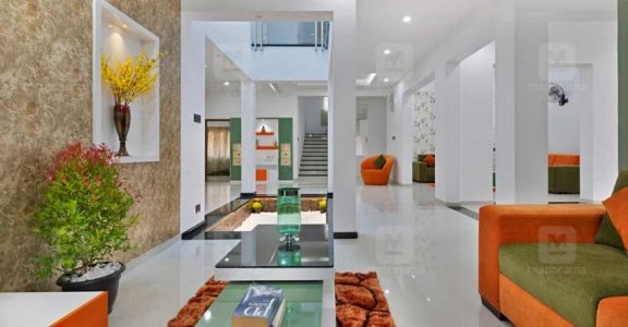 Designed in 4000 sq ft area, this magnificent mansion has a sit-out, foyer, living and dining areas, kitchen with a work area and four bedrooms. The interiors are designed in the open style which makes the spaces look vaster. The entrance door opens to the foyer which then leads to the living area that has double-heighted ceiling. Shades of orange and green that are part of the furnishing add the perfect contrast against the white walls here. The beautiful couch, the central coffee table and the niches on the walls are simple and elegant.