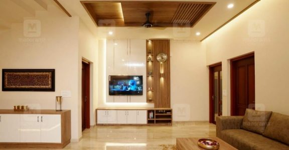 A grand swinging cot is what grabs your attention as soon as the entrance door is opened. Interestingly, the swing hangers are in brass which gives it classy elegance. One could enter this space through a corridor with double height ceiling. The open spaces and the double height ceiling make the interiors look extremely vaster. The formal living area is arranged by ensuring enough privacy. Meanwhile, the family living area is arranged beneath the stairway to save space.