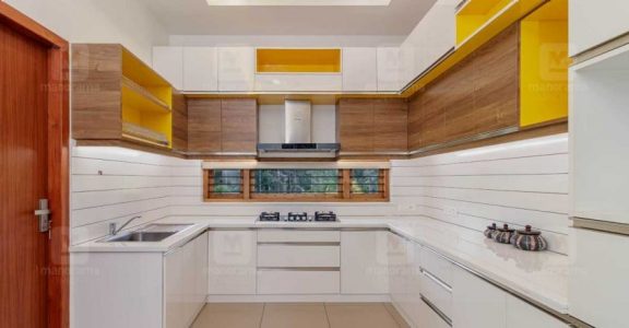 The kitchen cabinets are made in multi wood with laminate finish. The counter top, meanwhile, has been paved with nano white. An adjacent work area too has been arranged as part of the kitchen.