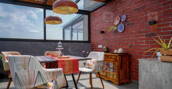 As the flat is on the uppermost floor, the family enjoys the luxury of two open balconies. Smart planning and perfect execution has granted this flat the unique cosiness of an independent house. The balcony beside the living area has been turned into dining space. This area has glass roofing fitted on GI frames that open to the sky and sliding glass windows too. A wall here is highlighted with brick cladding. Besides, the windows are secured with grilles to ensure added safety.