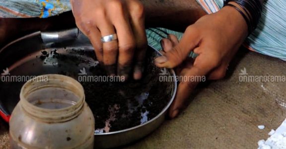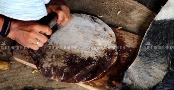 An even more difficult task demanding precision is creating the black circular ring that you spot on the centre of the mridangam sides and the tabla. The process of making them is called 'mashiyidal' and it is a time-consuming task. The black powder is obtained from a stone called puranakallu, rich in iron. These stones are available in plenty in Peruvemba and is mostly taken from temple ponds.