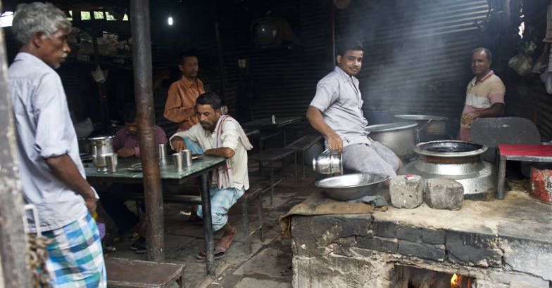 Daily wage workers have their morning meal at a roadside restaurant in a scrap market in New Delhi. File photo: AFP/Getty Images