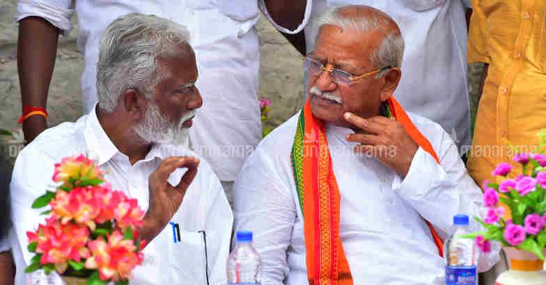 BJP Kerala unit president Kummanam Rajasekharan with Union MoS Ramesh Chandappa in Kollam on Saturday. Photo: Rahul R. Pattom