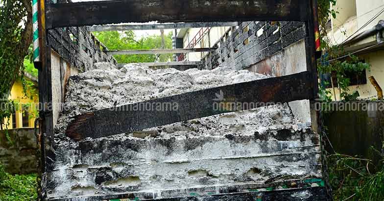 Photo: Rahul R. PattomIt is suspected that the lorry caught fire as necessary precautions were not taken while transporting huge amounts of the chemical. The driver and cleaner were sleeping inside the lorry stationed at Chinnakada.