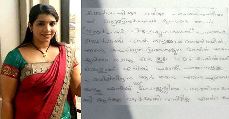 "I told mediapersons that Oommen Chandy was like a father to me because Chandy and Thambanoor Ravi told me to do so. Chandy had a major part to play among the UDF leaders who exploited me in my helpless phase on the pretext of my company. The man I was supposed to go for relief himself was an exploiter.