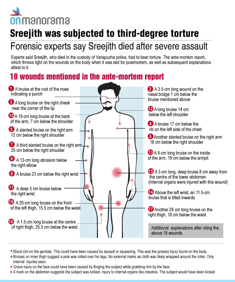 Sreejith received fatal injuries outside the station, but wounds caused by the torture at the station worsened his condition.