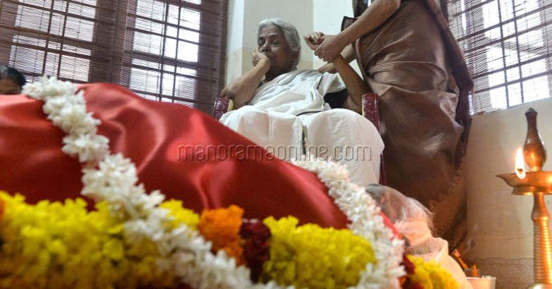 Poet Sugathakumari with the body of Sujatha Devi. Photo: Manoj ChemancheriLike her elder sister, Sujatha Devi had also written poems, all of which were published in her surname Devi. She is better known for her travel writing.