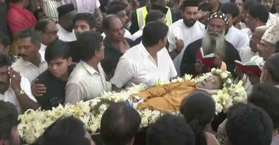 Prior to this, the actor's mortal remains were kept at the cathedral for the last rites. Thousands, including actors, politicians and other VIPs paid tributes to the legendary actor at the public homage held in Irinjalakuda town hall, at his residence and Rajiv Gandhi Indoor Stadium in Kochi on Monday.