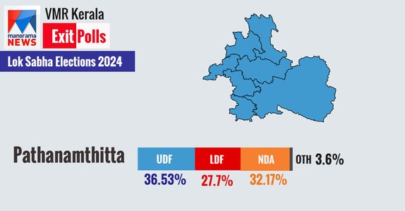 Pathanamthitta: ManoramaNews-VMR exit poll has predicted the BJP would make a significant advance in Pathanamthitta even though it may not win the seat. As per the survey, UDF is expected to retain the constituency.