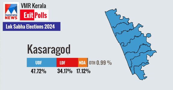 As per the survey, the UDF got the maximum number of votes in the 2024 LS polls from Kasaragod, a gain of 4.55 per cent votes compared to the 2019 polls. This was also reflected in losses for the LDF, which saw an erosion of 5.33 per cent from its kitty. The BJP also saw its vote share increase by 1.12 per cent. Overall, the UDF is expected to get 13.55 per cent more votes than the LDF, the exit poll indicated.