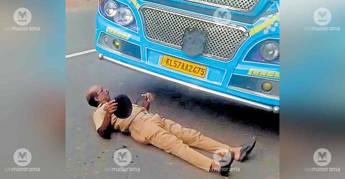 The incident occurred at the Markas bus stop yesterday around PM when Vellalassery Nagarajan, attached to the Kunnamangalam police station, staged the protest by lying in front of a private bus operating from Mukkam to the town.