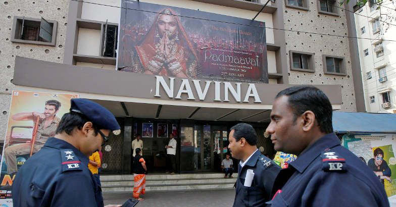 Police officers stand outside a theatre after the release of Bollywood movie 'Padmaavat' in Kolkata,. Reuters