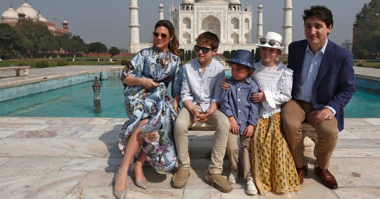 Canadian prime minister Justin Trudeau, his wife Sophie Gregoire Trudeau, their daughter Ella Grace and sons Hadrien and Xavier pose in front of the Taj Mahal in Agra, India, February 18, 2018. Reuters