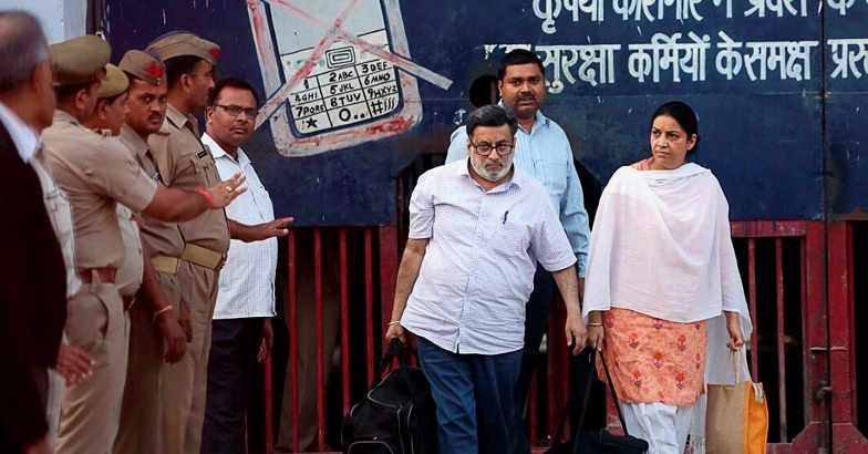 Dentist-couple Nupur and Rajesh Talwar coming out of the Dasna Jail in Ghaziabad after they were released following their acquittal in the twin murder case of their daughter Aarushi and domestic help Hemraj. File/PTI