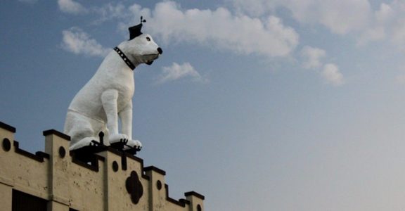 1. This statue, located in a US city, is the biggest of its kind in the world among that series. Owned by a painter, it become one of the most successful mascots in the world. The dog was named after a particular activity. Of which famous company was this dog originally a mascot of?