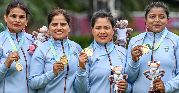The Indian quartet of Lovely Choubey (lead), Pinki (second), Nayanmoni Saikia (third) and Rupa Rani Tirkey (slip) beat South Africa 17-10 in the women's fours final.