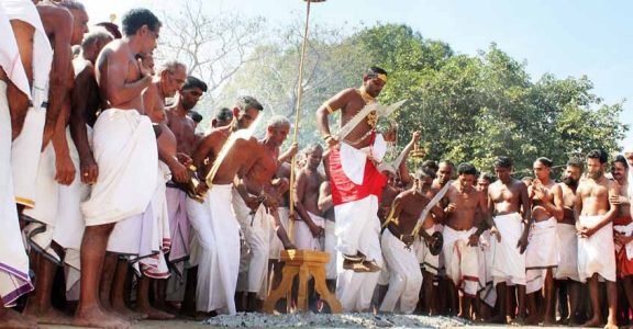 The persons holding the title of 'komaram' also lead a very austere life. They carry the divine sword and shield, wear anklets and a belt with hanging bells around the waist and foretell the future. Pushpajan Komaram of Muchilottu kavu says that only deep devotion to the goddess prompted him to take up the task.