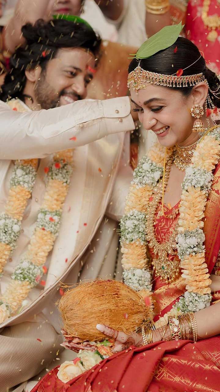 Actress Aishwarya Arjun, daughter of actor Arjun Sarja, tied the knot with actor Umapathy Ramaiah, son of Thambi Ramaiah, in a traditional ceremony.